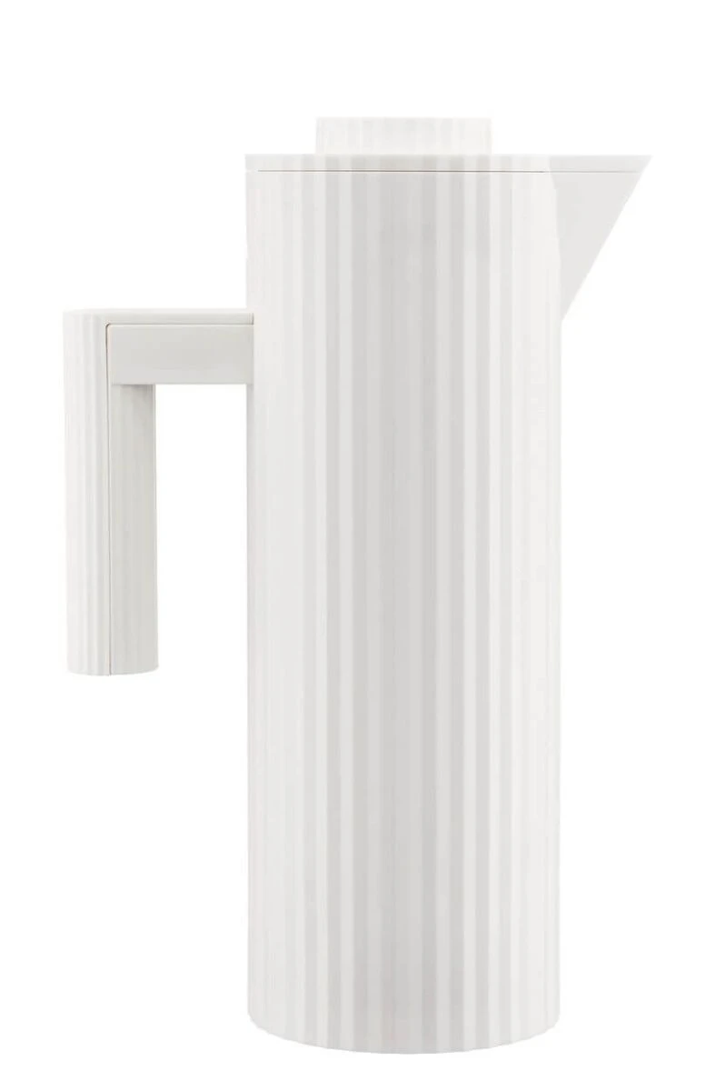 De Alessi Plissé thermosfles is gemaakt van witte kunststof en is dubbelwandig met thermisch glas aan de binnenzijde. De inhoud van de thermosfles is 1 liter. De waterkoker is 32 cm hoog, 20 cm breed en een diameter van 11 cm. De Plissé thermoskan is ontworpen door Michele De Lucchi.